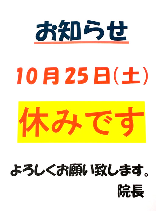 2025年10月の診療スケジュール 2025年10月25日は、勝手ながら休診させていただきます。 どうぞご了承ください。 ++++++++++++++++ ■大友はり柔道接骨院 〒577-0832 大阪府東大阪市長瀬町3-8 23棟1F JR おおさか東線 長瀬駅より徒歩1分 (デイリーヤマザキ向かい) 2025年10月23日 |当院からのお知らせ