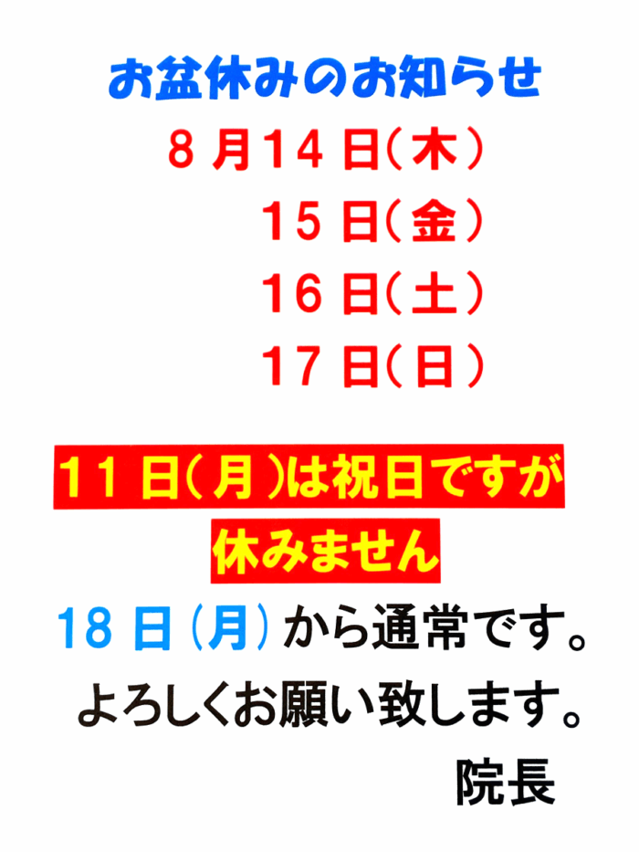 2025年8月は、下記の通り診療スケジュールの変更がございます。