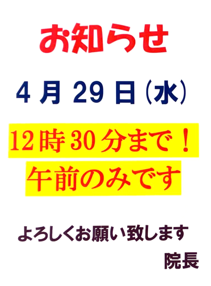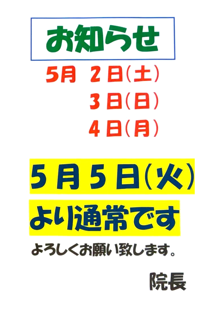 2026年のゴールデンウィークは、以下の通り診療スケジュールの変更がありますので、ご了承ください。